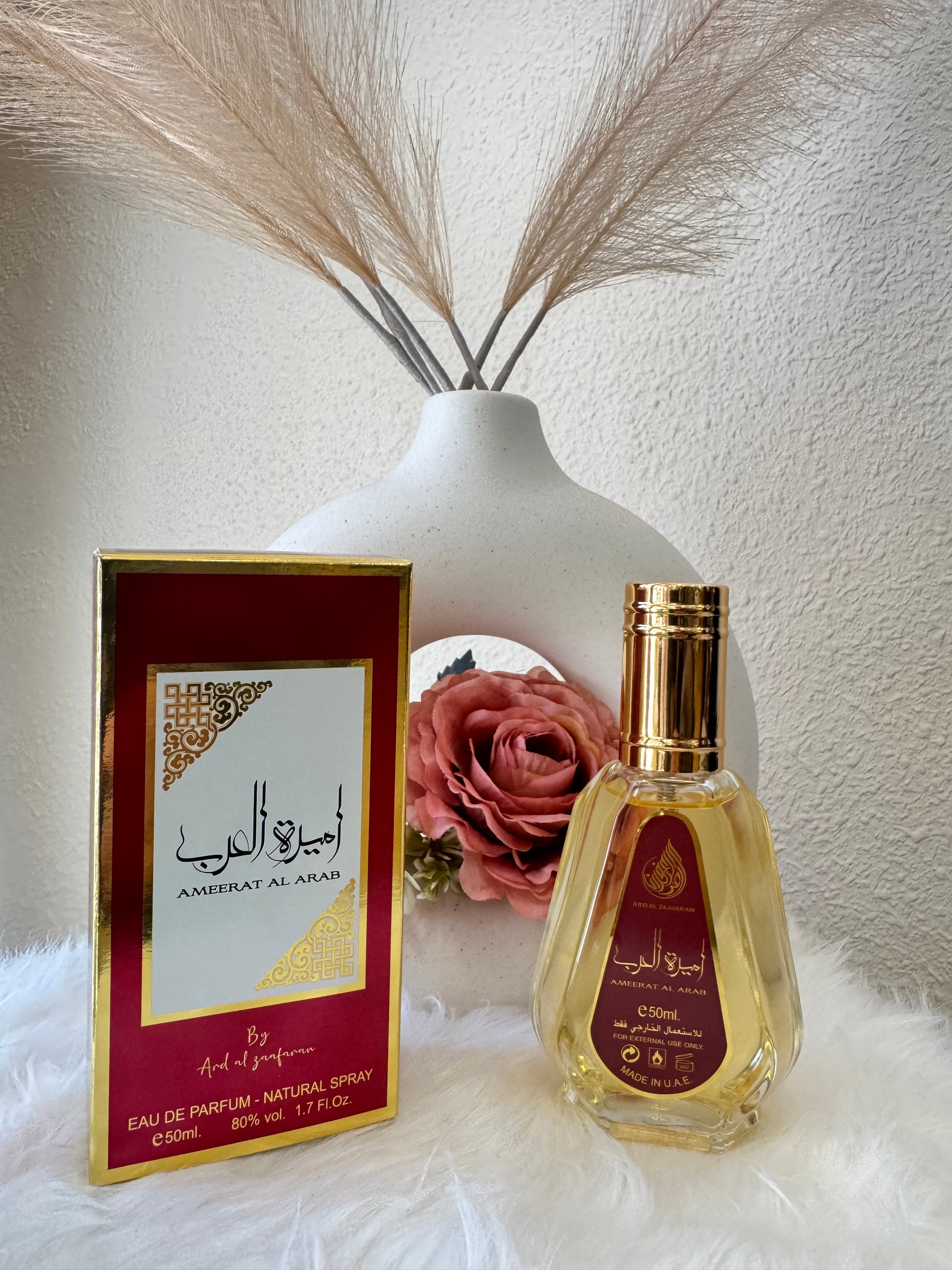 Ameerat Al Arab de Ard Al Zaafaran es una fragancia femenina intensa, elegante y envolvente, con un carácter oriental y sofisticado. La salida es fresca y ligeramente afrutada, aportando luminosidad desde el primer momento. En el corazón aparecen notas florales suaves que aportan feminidad y equilibrio, mientras que el fondo es cálido y sensual, con acordes ambarados y almizclados que dejan una estela duradera y muy agradable. Es un perfume ideal tanto para el día como para la noche, perfecto para quienes buscan un aroma elegante, femenino y con presencia.