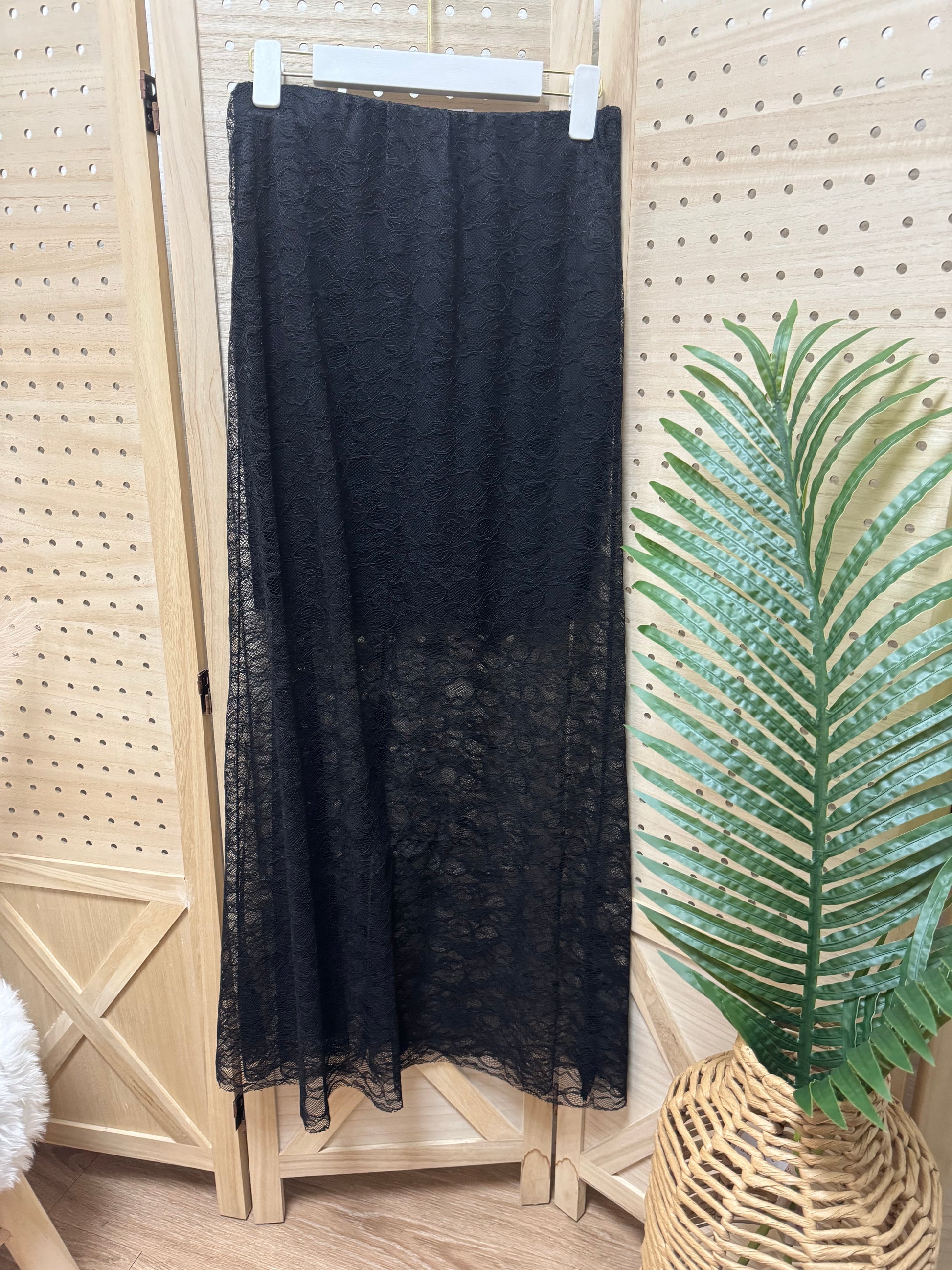 Falda larga de encaje negro, con cinturilla elástica para mayor comodidad. Lleva forro interior hasta la rodilla, dejando el bajo ligeramente transparente, lo que aporta un toque elegante y muy femenino. Ideal tanto para looks especiales como para combinar en un outfit más casual.