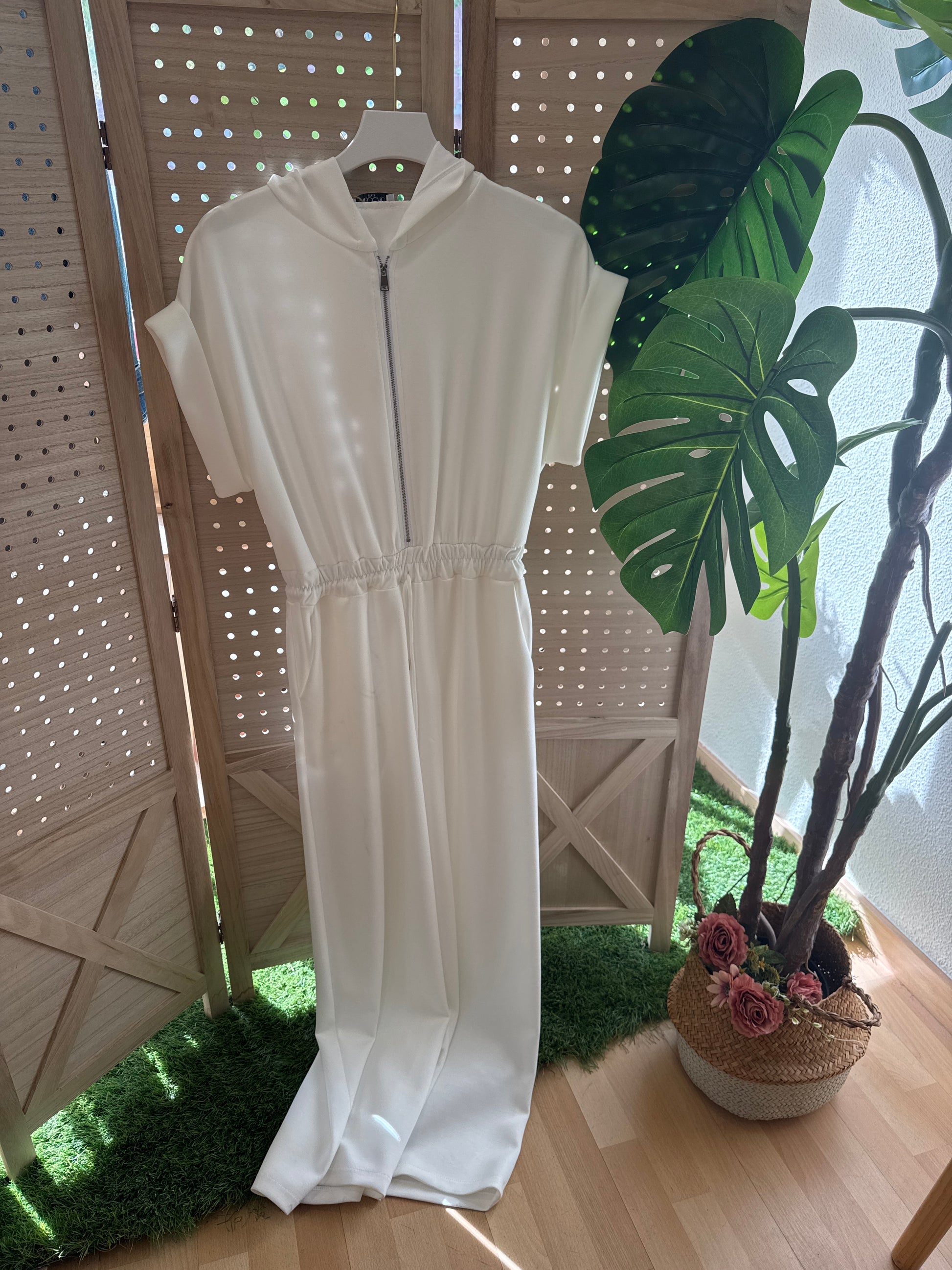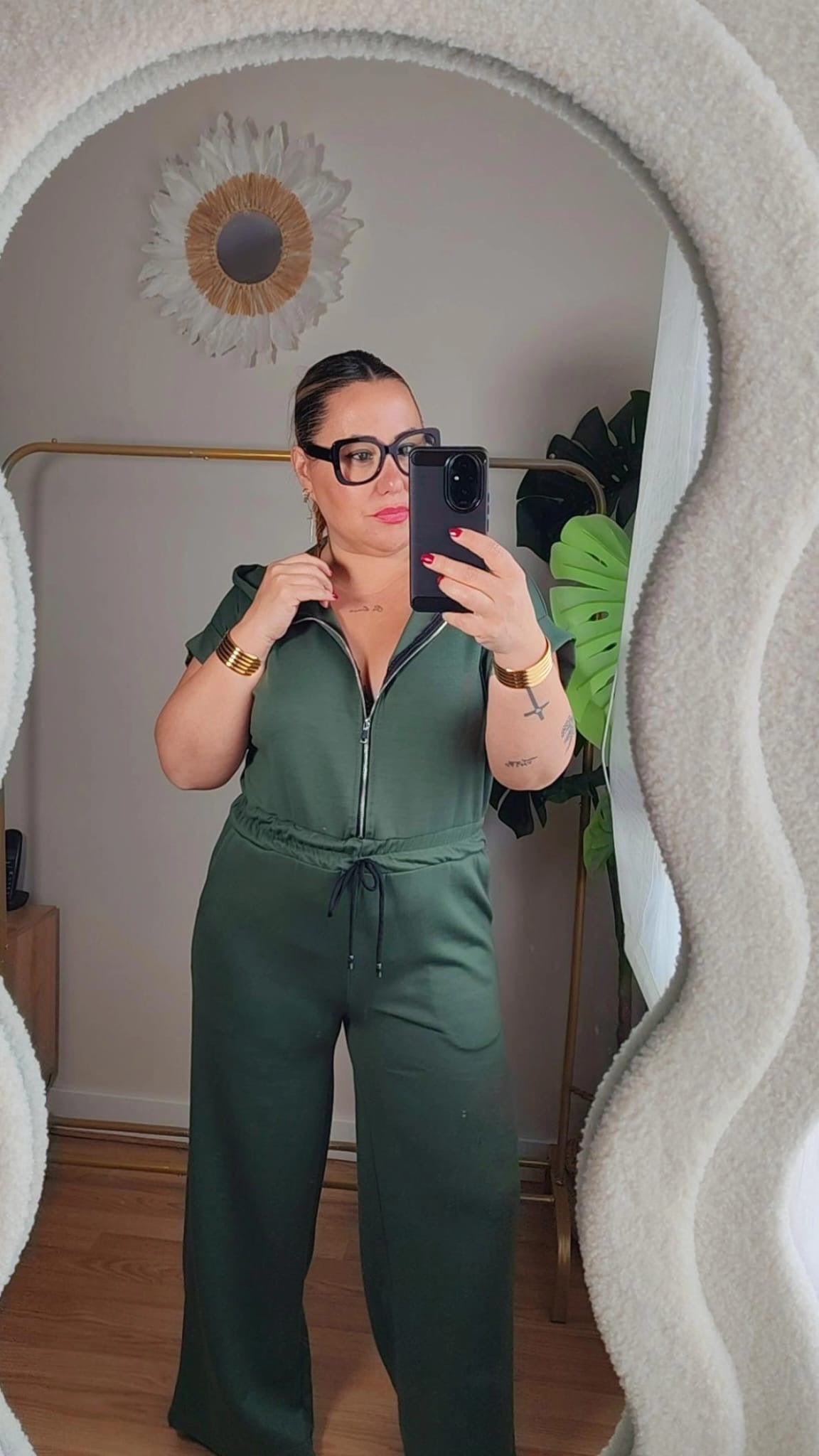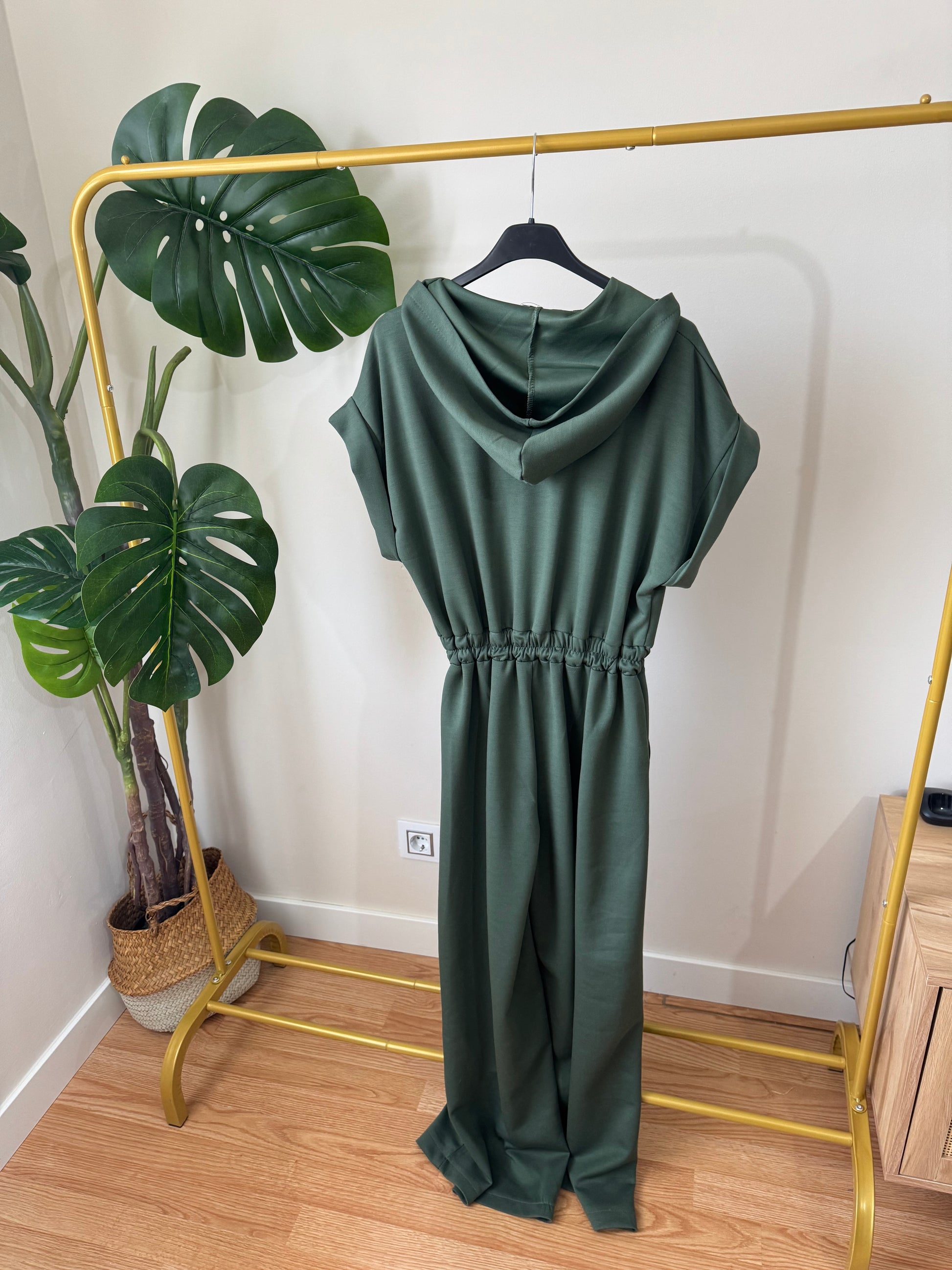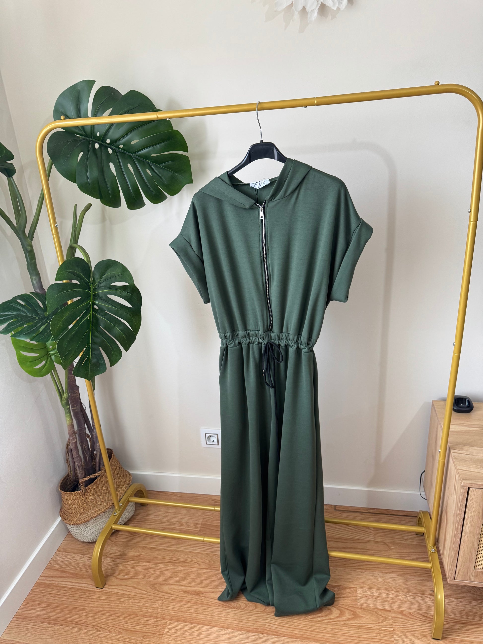 Nuevo mono verde militar de manga corta, con cremallera frontal, capucha y cordón negro para entallar a tu gusto.