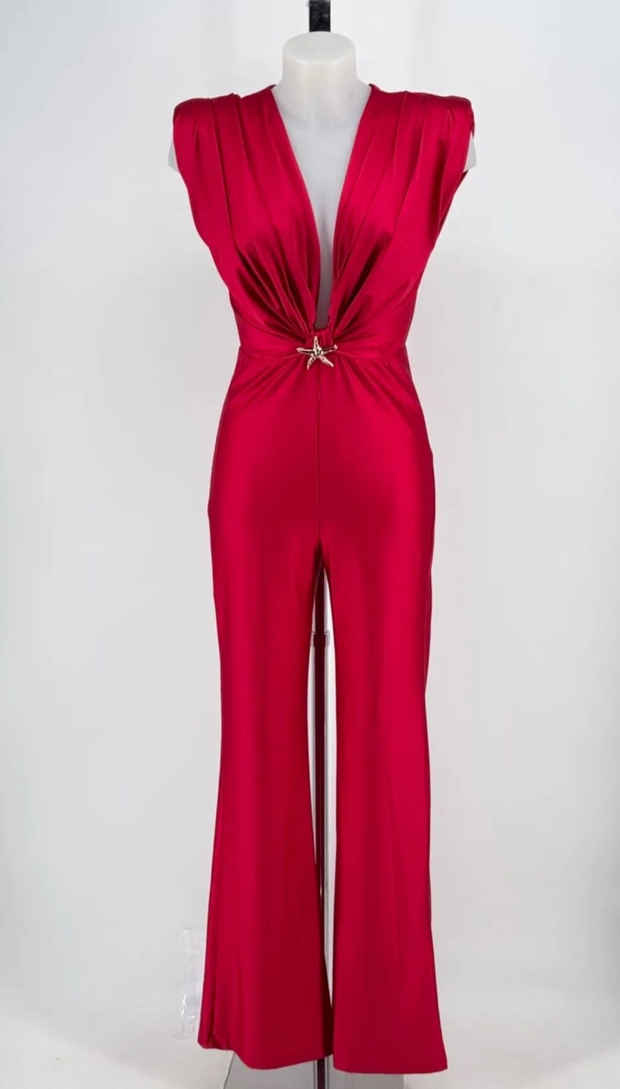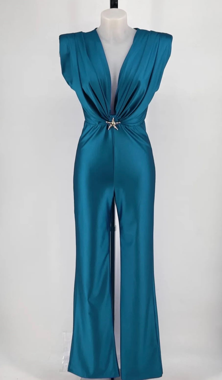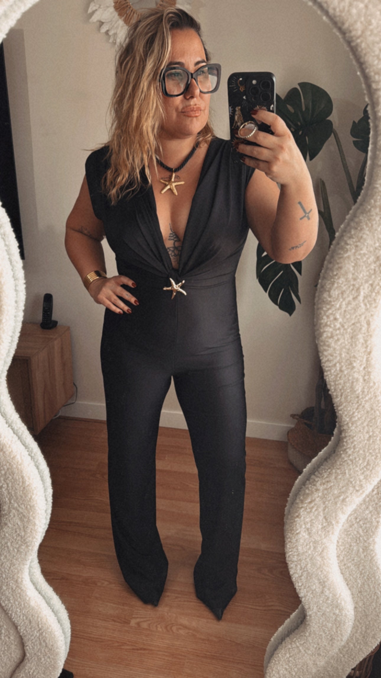 Este mono largo es la prenda perfecta para lucir estilizada y con un toque de originalidad. Su escote cruzado realza el pecho y aporta un efecto muy favorecedor, mientras que el detalle dorado en forma de estrella en la cintura le da un aire sofisticado y diferente. Su tejido es cómodo y con caída, ideal tanto para eventos como para una noche especial.