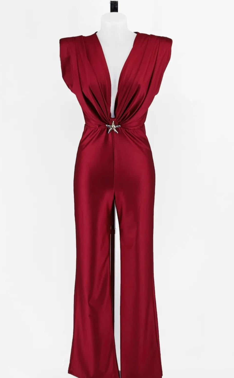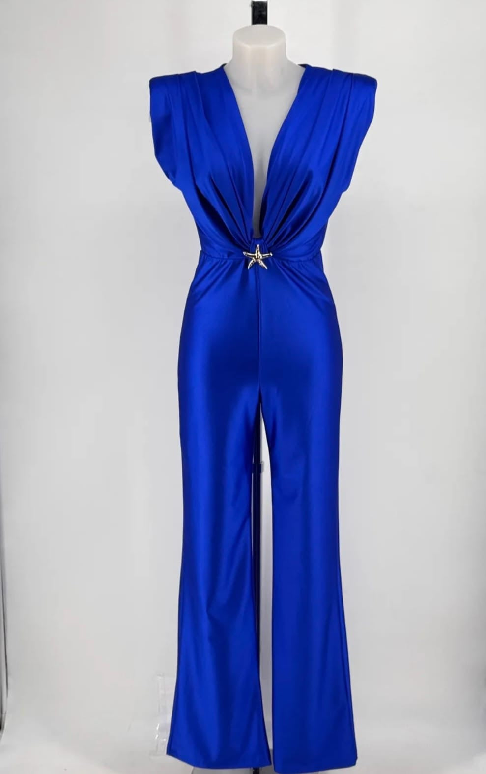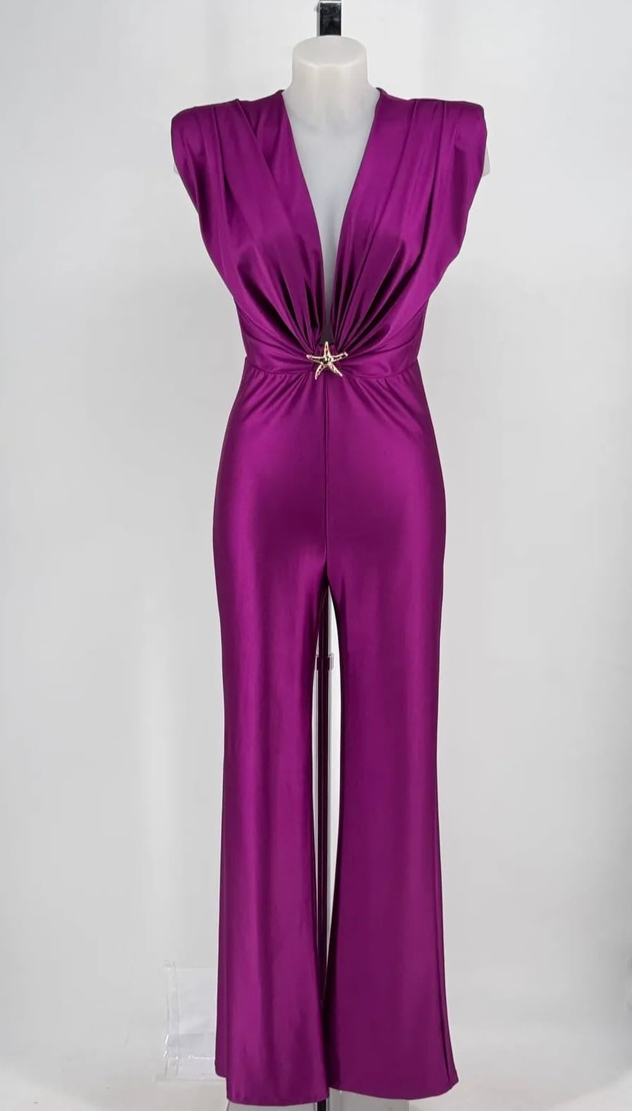 Este mono largo es la prenda perfecta para lucir estilizada y con un toque de originalidad. Su escote cruzado realza el pecho y aporta un efecto muy favorecedor, mientras que el detalle dorado en forma de estrella en la cintura le da un aire sofisticado y diferente. Su tejido es cómodo y con caída, ideal tanto para eventos como para una noche especial.