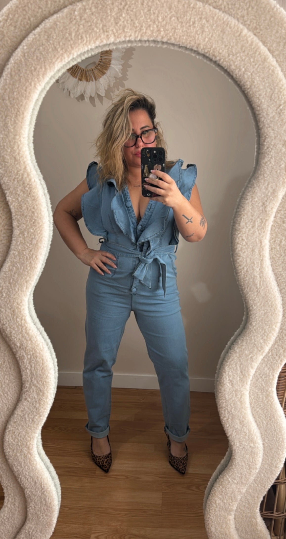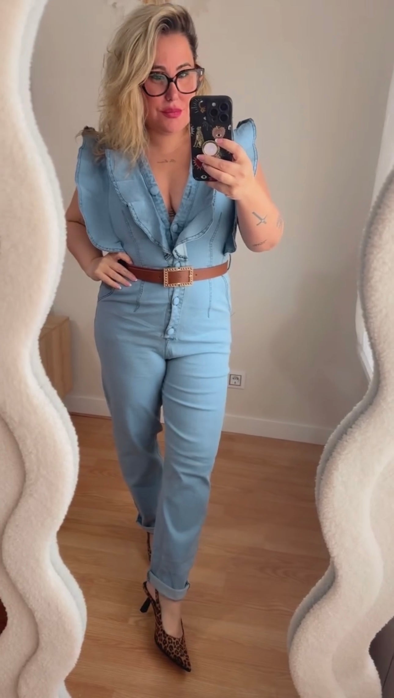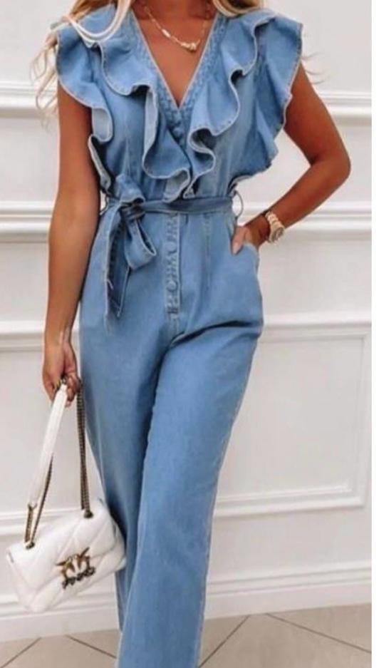 ¡espectacular! 😍 Si buscas un look femenino, estiloso y con ese toque especial, este mono es para ti. Su diseño con volantes y cinturón ajustable realza la silueta, y su tejido denim elástico es perfecto para cualquier ocasión. ✨