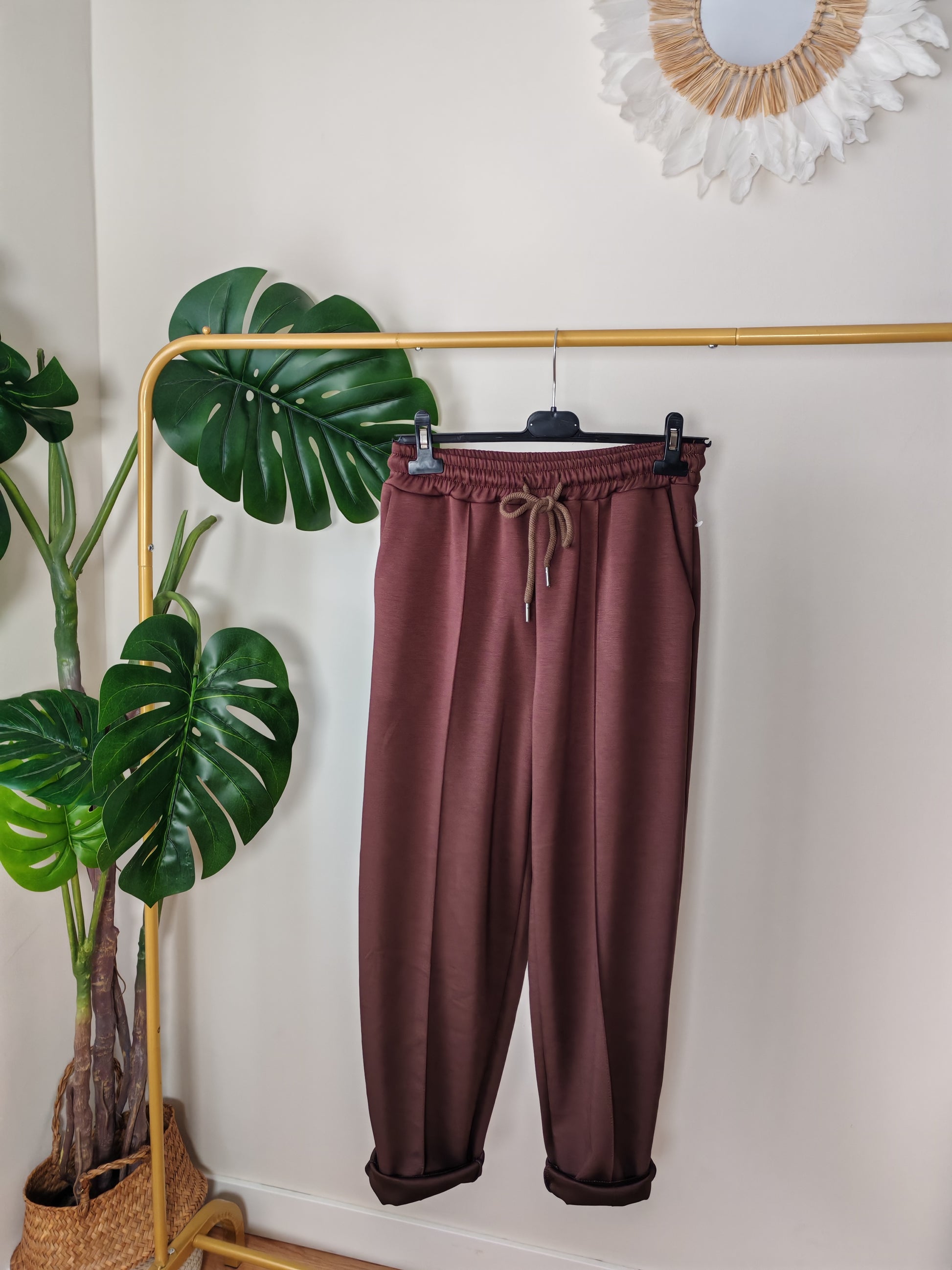 El pantalón "Choco Chic" combina comodidad y estilo en una prenda versátil que puedes llevar tanto con tacones como con zapatillas. Su tono marrón chocolate es perfecto para crear looks sofisticados o más relajados, y su tejido suave con caída se adapta a tu cuerpo sin marcar. Lleva cintura elástica con cordón ajustable y detalles pespunteados que estilizan la pierna.