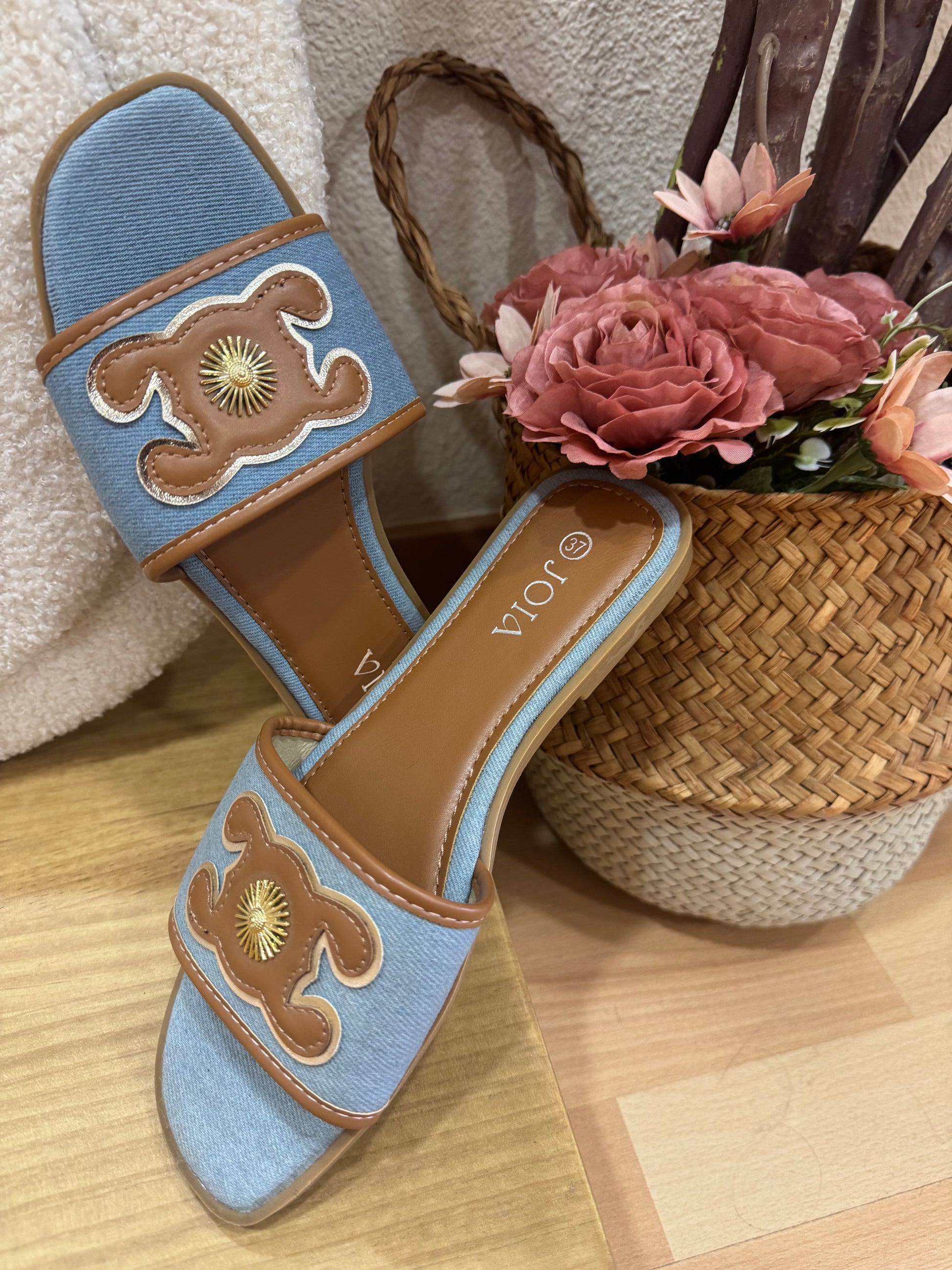 Sandalias tipo pala en tejido denim azul, con detalle dorado y acabado en camel.