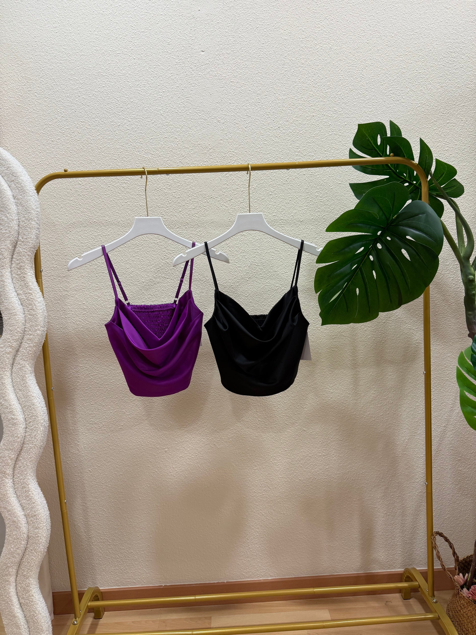 El Top Brisa es elegante, femenino y con ese toque de brillo que marca la diferencia. Confeccionado en tejido satinado, su escote drapeado y tirantes finos realzan el pecho de forma delicada y favorecedora.